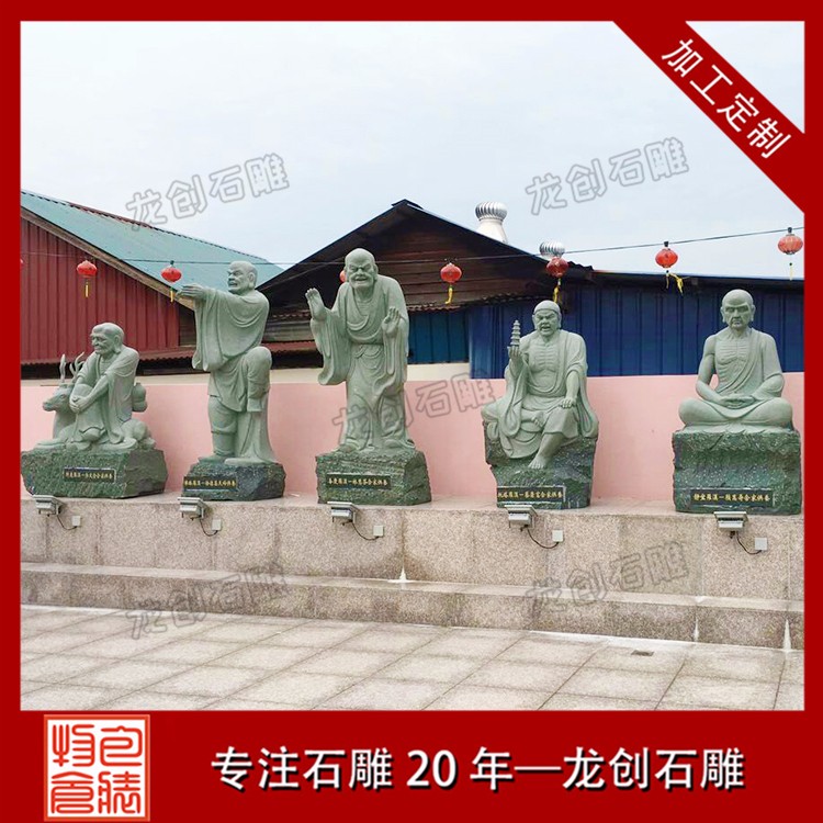 佛教寺廟石雕十八羅漢雕塑一般采用天然石材加工制作而成,有花崗巖(芝麻白、芝麻黑、芝麻灰、蝦紅)、青石等,有的則會用漢白玉石材制作。用于室外擺放石雕十八羅漢像通常建議用花崗巖石材雕刻,按順序擺放在兩側。漢傳佛教的石雕十八羅漢隨著雕塑文化的發展,造型有立像、坐像、坐立結合的三種雕刻方式。從雕刻工藝上區分有浮雕、圓雕、透雕、線雕等,只要質量做工好,不論采用何種形式,都可以按照寺院的需求,很好的將十八羅漢文化表達出來。