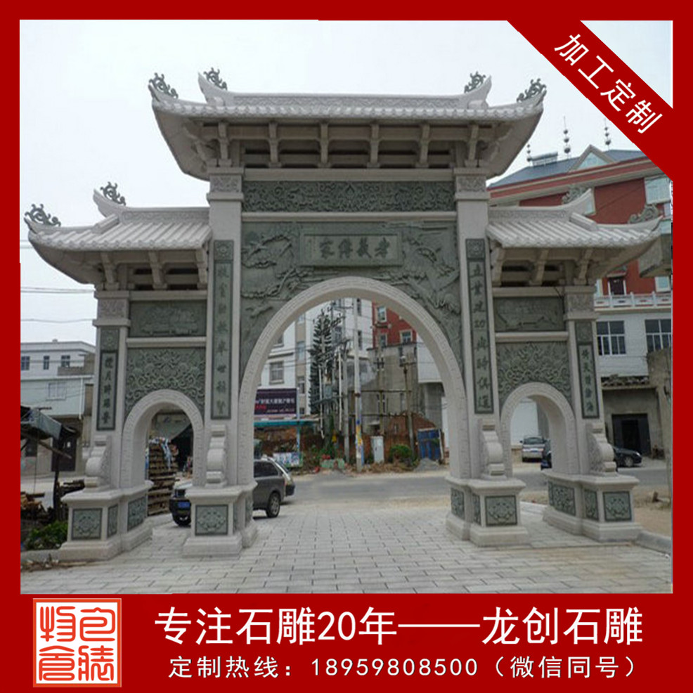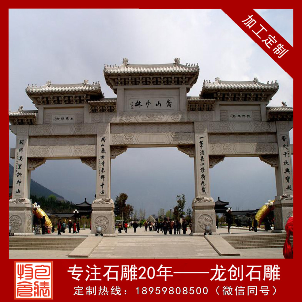 山門牌坊是中國建筑藝術中的主要代表,也是傳統建筑形式,在中國漫長的歷史長河中更見設計魅力。山門牌坊的出現其實可以追溯到原始社會時期,氏族聚居的部落都會有這樣的門型建筑,早期的設計比較簡單,就是兩根柱子和一根橫梁,從木山門牌坊到石山門牌坊,石雕技術讓山門牌坊擁有了更為細膩的雕刻情感。龍創石雕山門牌坊廠家作為國內雕刻歷史悠久的專業專業雕刻廠家,提供了更多精致的石雕山門牌坊作品,讓其演繹雕刻工藝的文化傳統。