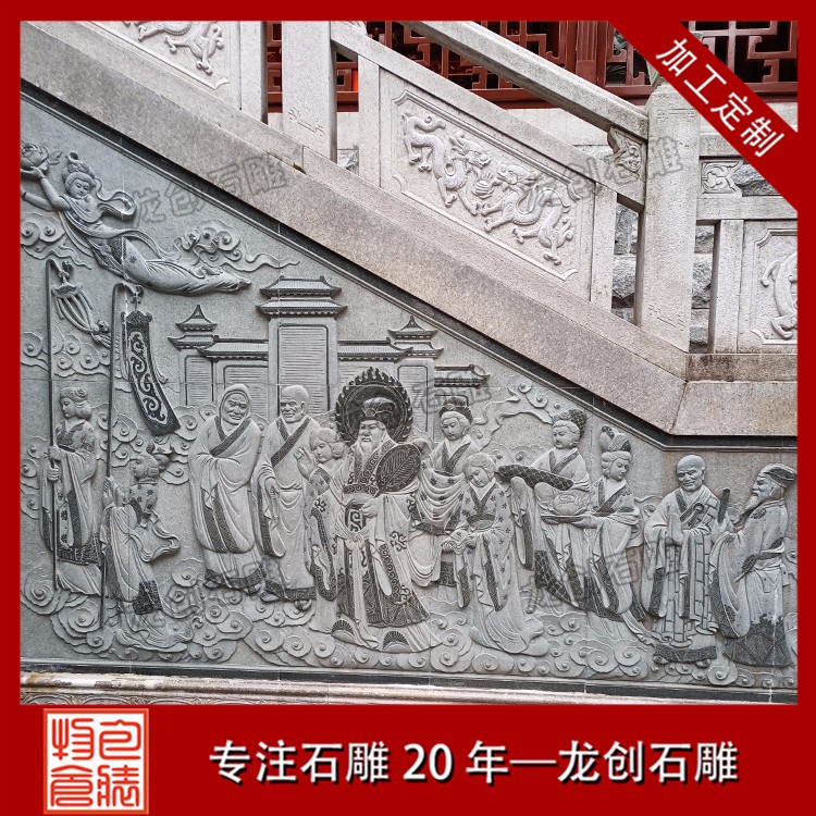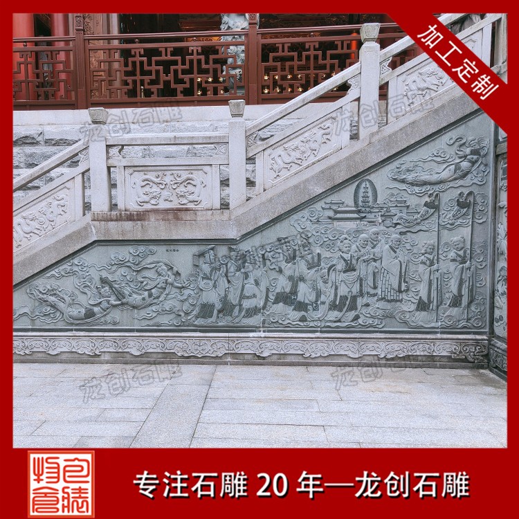 佛教寺院文化墻浮雕所雕刻的內容涵蓋了許多方面,有的是寺院的歷史變革,有的是諸佛菩薩的經典典故,有的則是寺院供奉主佛、菩薩的一些人物故事,這些所謂的典故中必然是佛經中有明確記載的。這種浮雕文化墻一般會采用青石或芝麻黑花崗巖石料,因為這些石材的顏色相對深一些。在雕刻人物形象時,可以清晰地體現出來,包括人物的每一個動作。