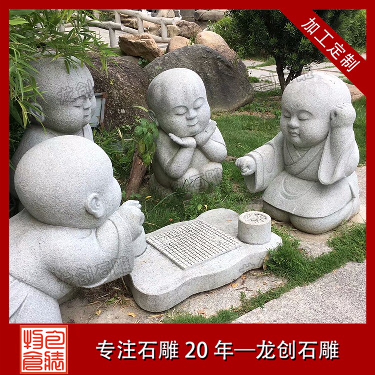 石雕小和尚就是用石頭雕刻制作的小和尚造型,一般都是7歲以上,20歲以下的孩童雕塑。由于小孩的天真爛漫,各種各樣有趣的造型都會做出來,比如下棋的小沙彌,睡姿的小沙彌、嬉戲的以及功夫小沙彌,打掃衛生的等等,也有一些修行的小沙彌造型,比如參禪打坐的造型,敲木魚的造型。石雕小和尚的百態千姿是寺廟諸佛菩薩雕塑里面較多的一種,也是讓信眾們發自內心的喜愛和尊敬的一種佛教弟子塑像。