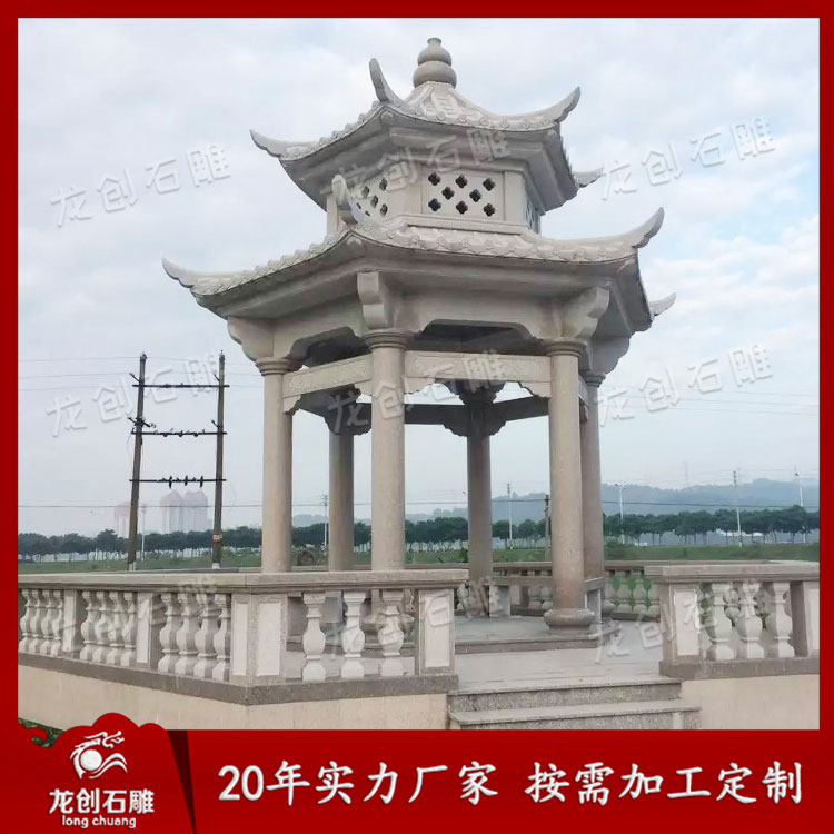 石雕雙層涼亭作為一種景觀建筑,經常的與空間環境作為主題形式出現。這樣我們可以從各個角度欣賞。但是它又不是一個實體,更多地強調其虛空的內部與周圍的空間環境之間的聯系,這樣就通過建筑造型的外在形象,在周圍空間中起到點睛的作用。它追求的是一種整體美、自然美、古典美。