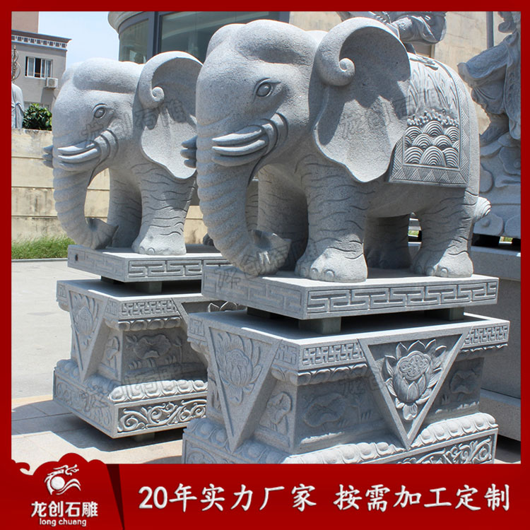 石雕大象造型各異,款式不同,所以我們可以在市面上見到各種形形色色的石雕大象作品。石雕大象在一些大型景區經常看到,例如南京牛首山廣場擺放十二只大小相同,卻形態各異的石雕大象;廈門南普陀寺門口擺放著一對做工精細,雙面雕龍,威猛無比的仿古石雕大象;深圳大鵬東山寺山門腳下則擺放著石獅子、石象各一對,還有一對哼哈二將守護著寺院,并庇佑當地百姓。