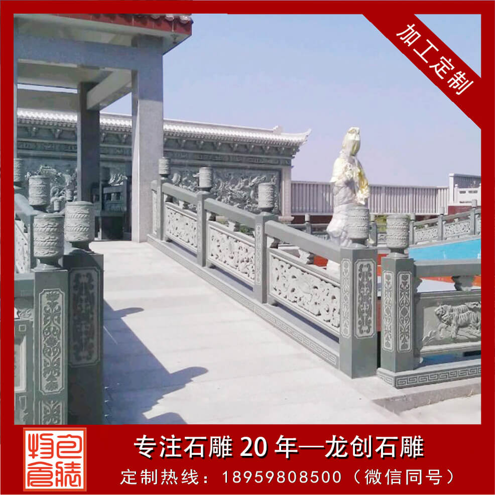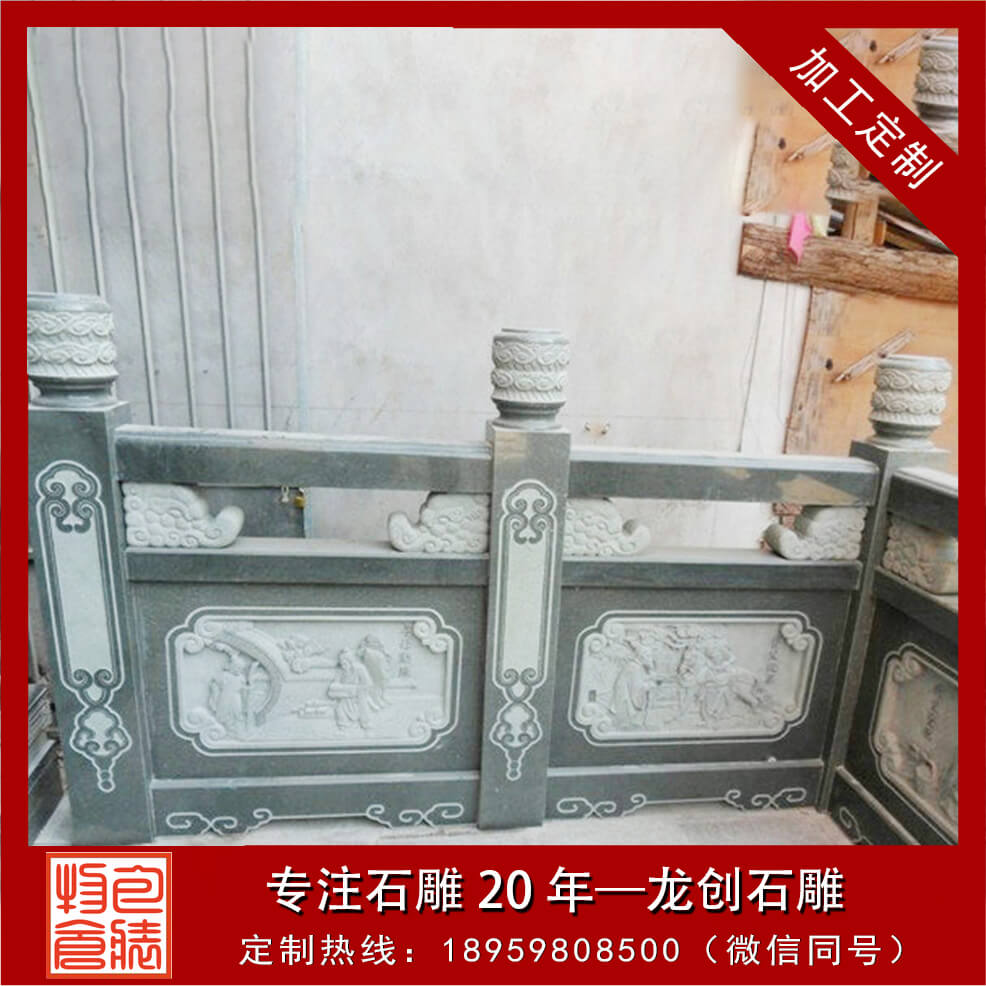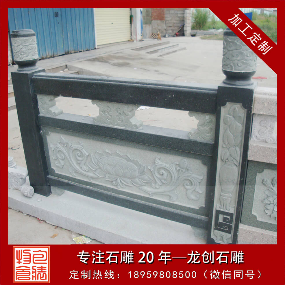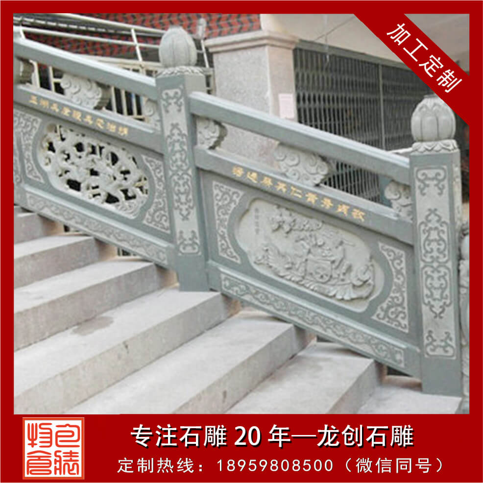 石頭欄桿一般出現在古建筑大殿周圍、橋面、路面上,起到保護行人安全外,石頭欄桿還可裝飾環境,又能豐富人們的活,陶冶人的情操,給人以美的享受。石頭欄桿、石頭欄桿的構成石頭欄桿有柱頭、立柱、扶手、花托、欄板、地鋪幾部分組成。透空的帶花格或圖案的實心欄桿,也有實心的欄板局部透空或全部不透空的欄桿。