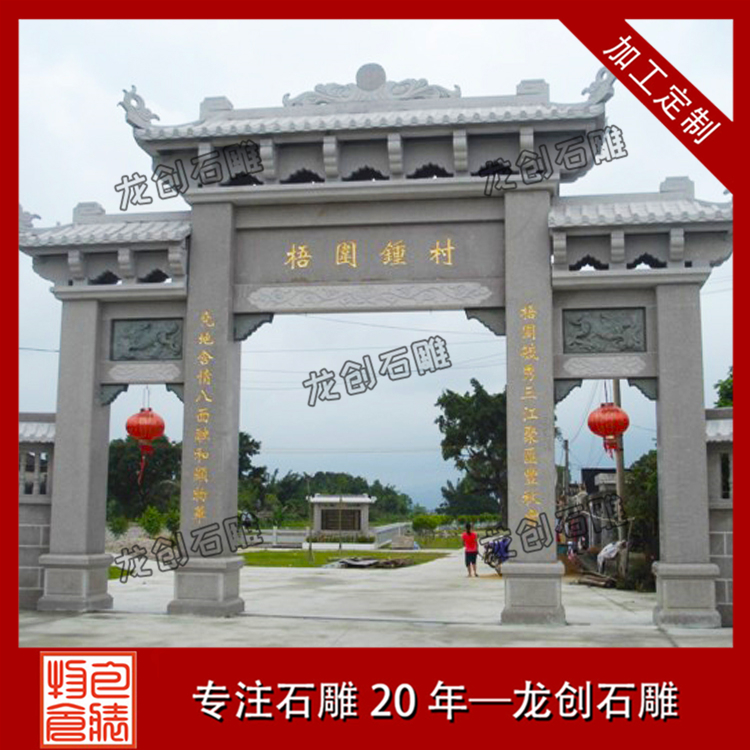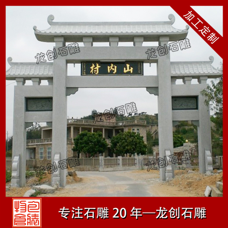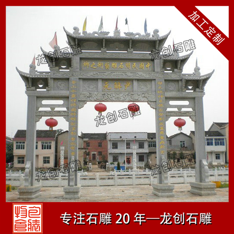 鄉(xiāng)村入口村牌坊的建造不僅是村莊的的一個標(biāo)志,它還代表著人們美好愿望的一種寄托。首先是石牌樓的建造作為一種標(biāo)志性的建筑,它用以標(biāo)明地名,在村子的入口處就能傳遞一種信息。同時(shí)石牌樓的安裝也代表著人們生活水平的,因?yàn)橐蛔茦堑膬r(jià)格相對來說還是比較昂貴的,即使單門的石牌樓價(jià)格也要幾萬元。